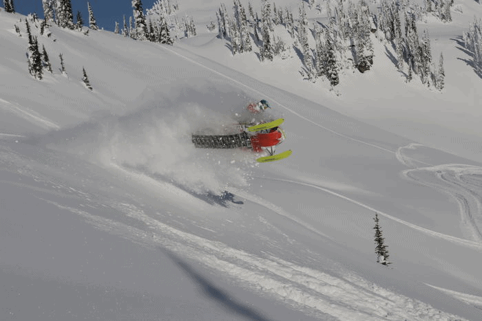 Dagen fortsätter med massvis med drops och hopp. Vi kommer till ett riktigt brant område där vi sidehillar fram och tillbaka, vill hitta en bra vinkel, klämmer stumt och nästan högst upp på backen kastar jag skotern åt sidan och gasar fast den. Kim kommer för fulla muggar bredvid mig, får ett snedkast och flyger av, jag står för bildbeviset.