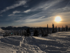 Solen börjar gå ned och vi får en magisk solnedgång. Vi åker ned mot fjällets fot och lastar på skotrarna. Alla är supernöjda med dagen och vi bestämmer oss för att dricka några kalla ihop samma kväll.