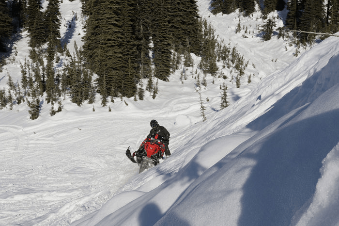 Söker mig upp bland tät granskog och hittar den första backen och testar lite skrååkning. Då snön är blöt fäster sig skotern lätt mot bergssidan. Pumpgasar mig över kanten, vilken fruktansvärt härlig känsla. Blir påmind över varför friåkning på skoter är mitt största intresse. Letar mig vidare, burkar över öppna ytor, testar en till brant med skrå åkning och lirar lite teknik bland träden. Jo tack, det mesta sitter kvar sen förra året. Puh!