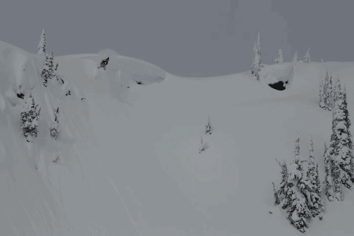 Nästa drop sitter längre bort längs samma klippvägg, Fredrik från Northern light films och jag hittar en skön vinkel nedanför ett par träd i branten, väl på plats kommer Cody fram till avsatsen, kastar nån snöboll för att kunna se landningen. Är ni redo!? frågar han, både jag och Fredrik gör tummen upp, några sekunder senare hoppar han ut och med burstmode på kameran ser jag till att fånga sekvensen.