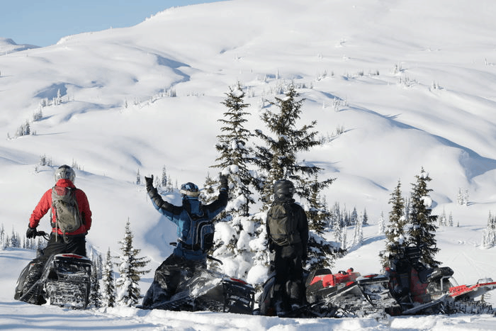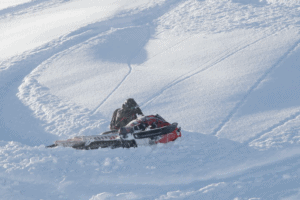 Färdas över leder med tunt snötäcke ju högre vi kommer desto djupare blir snön, på runt 1300 meters höjd når vi molntäcket och vi drabbas av sämre sikt under några kilometers ledåkning. Helt plötsligt öppnar himlen upp sig, strålande sol, inte ett moln på himlen och temperaturen stiger från kallt till behagligt, ett glädjetjut innanför hjälmen. Vi befinner oss på cirka 2000 meter och terrängen öppnar upp sig och trädlinjen blir synlig. Första lagret av snö är fluffigt torr och ca halvmetern djup. Ingen av dem lokala åkarna har besökt detta ställe tidigare i år vilket ger oss ”fresh tracks” hela dagen. Detta kommer bli en ruskigt rolig dag.