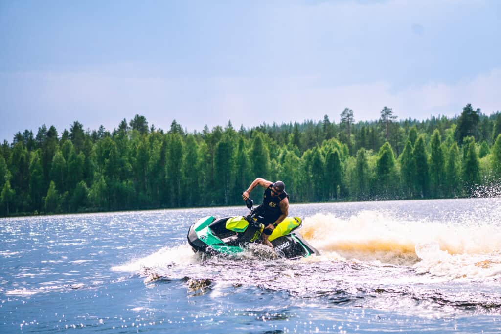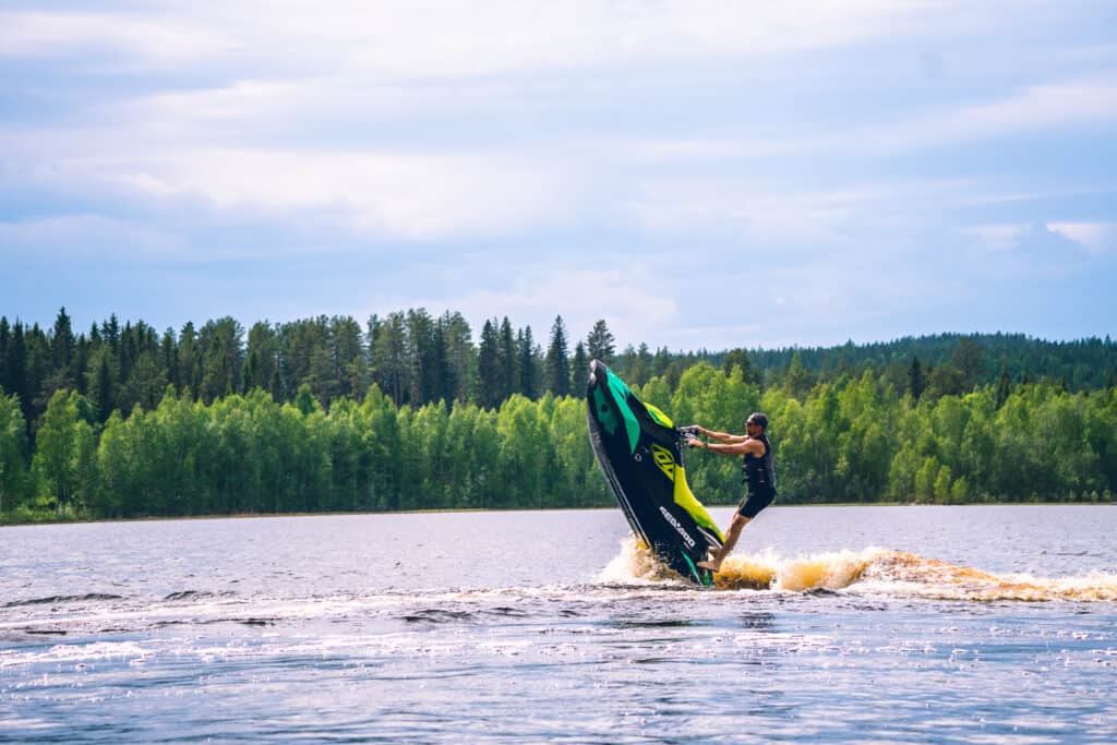 Redan under början av veckan såg vi att tempen började stiga och helgen verkade erbjuda ett bästa tänkbara förhållanden för att göra de första timmarna på våran Trixx. Fredag kväll när allt var packat hade undertecknad lite svårt att komma ner i varv, telefonen gick varm med olika youtube-klipp där man lekte med trixxen. Väl på plats lördagsmorgon backas vagnen mot vattnet för att lastas av, till min förvåning känns vattnet betydligt varmare än väntat när vi går ut med maskinen. Man ska ha med i åtankte att inte starta vattenskotern på för grunt vatten, det kan skada maskinen om det dras upp sand eller sten och även sjöbotten.