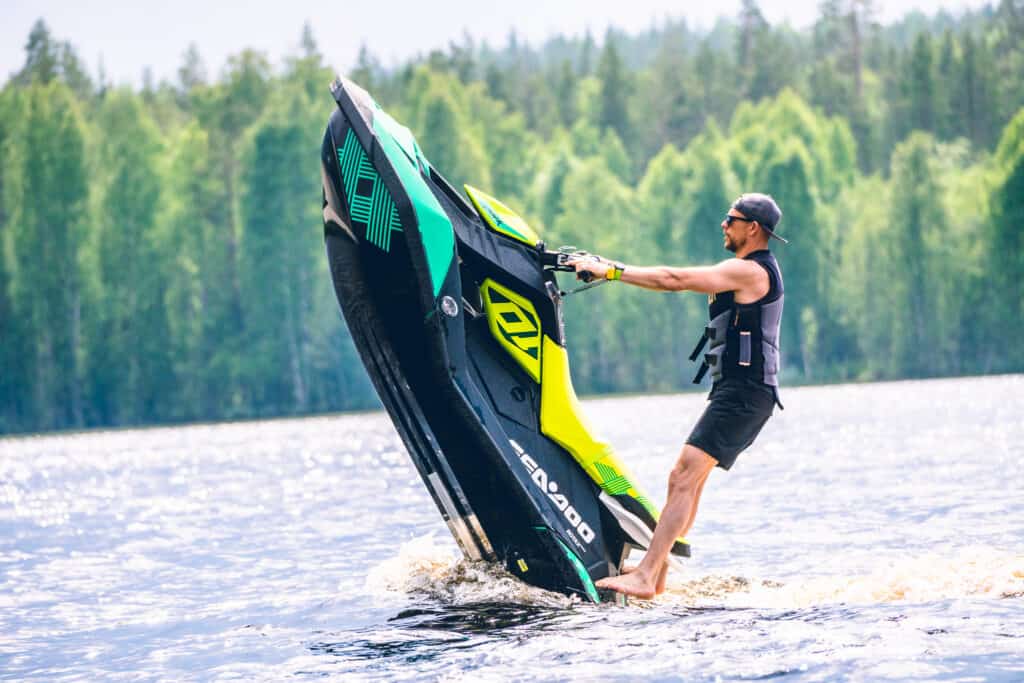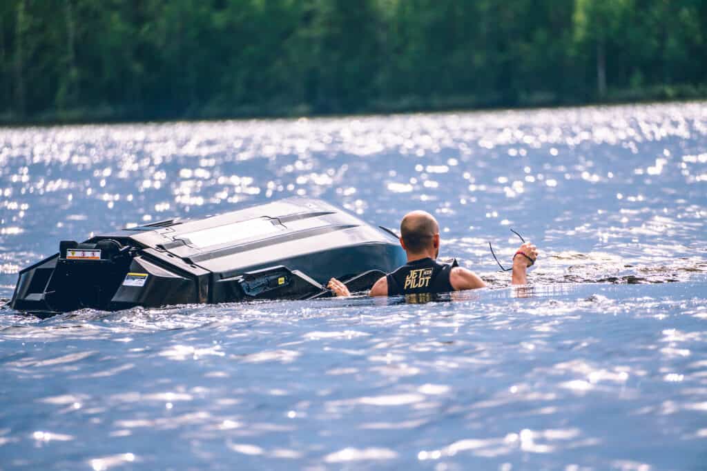Det går inte alltid som man tänker och vi har redan provat ligga upp och ner med vår partner. Här har BRP tänkt till då det finns anvisningar på vilket håll maskinen ska sättas på rätt köl igen för att inte få in vatten på oönskade ställen, det var dessutom relativt enkelt att vända maskinen i vattnet.