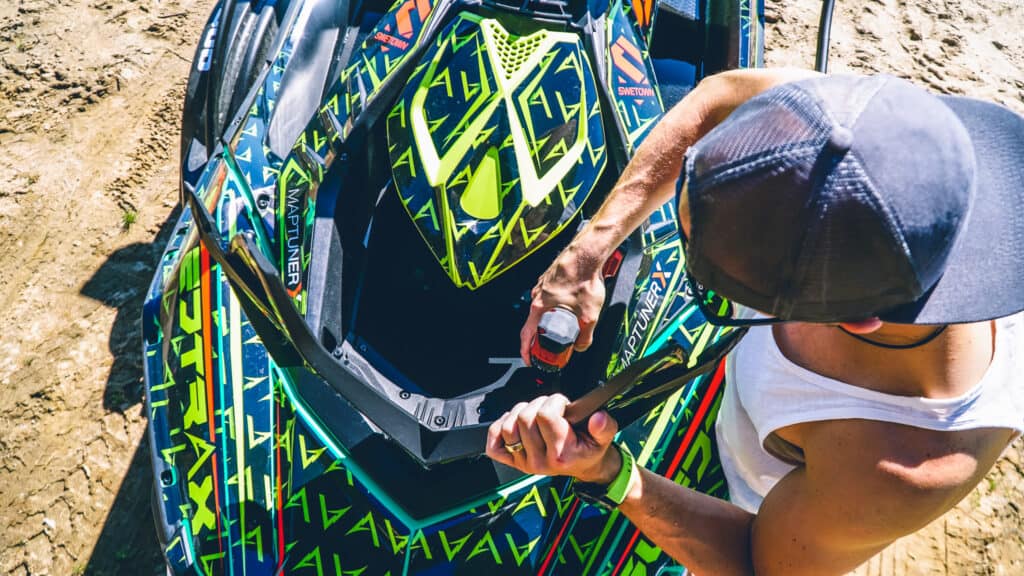 Förutom ovan nämnda delar har vi tagit hjälp av grabbarna på Lindroths Motor för att montera en ny kabelhärva, den krävs när du ska byta ut ordinarie nödstopp till en som har D.E.S.S och är kopplad till din maskin. I samma veva monterades även ett 12v uttag i det lilla facket under mätaren, där ryms de flesta telefoner och kan laddas under dagen. Nu känner vi att vår Sea-Doo Spark Trixx 3-up är redo för en lång och rolig sommar, vi har redan hunnit köra massor under den gula lampan och snart kommer en delrapport ut om detta busfrö.