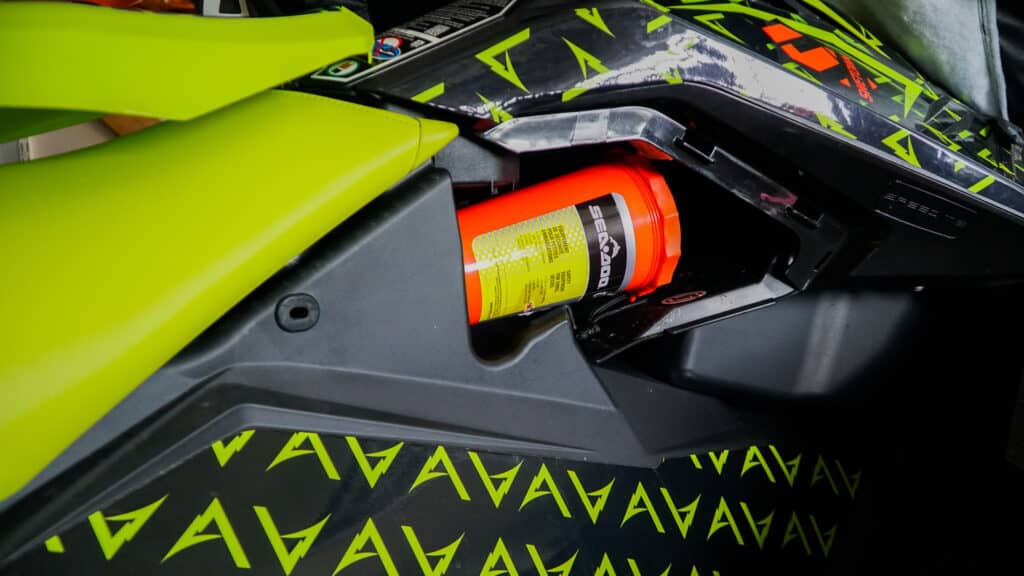 Man kan inte vara nog förbered när man ska ut på sjön, här har Sea-doo tänk till och gjort ett Safety kit som kan köpas för en billig peng. Det är kanske inget MacGyver kit men du hittar en del viktiga saker i det. 15 m flytlina för att kunna bogserad eller bli bogserad, ett öskar en visselpipa och en vattentät ficklampa. Den här tuben får sedan plats i facket under mittkonsolen, på så sätt har du alltid med den om behovet skulle finnas på ett eller annat sätt.