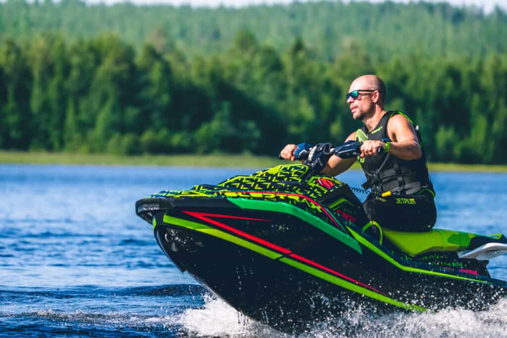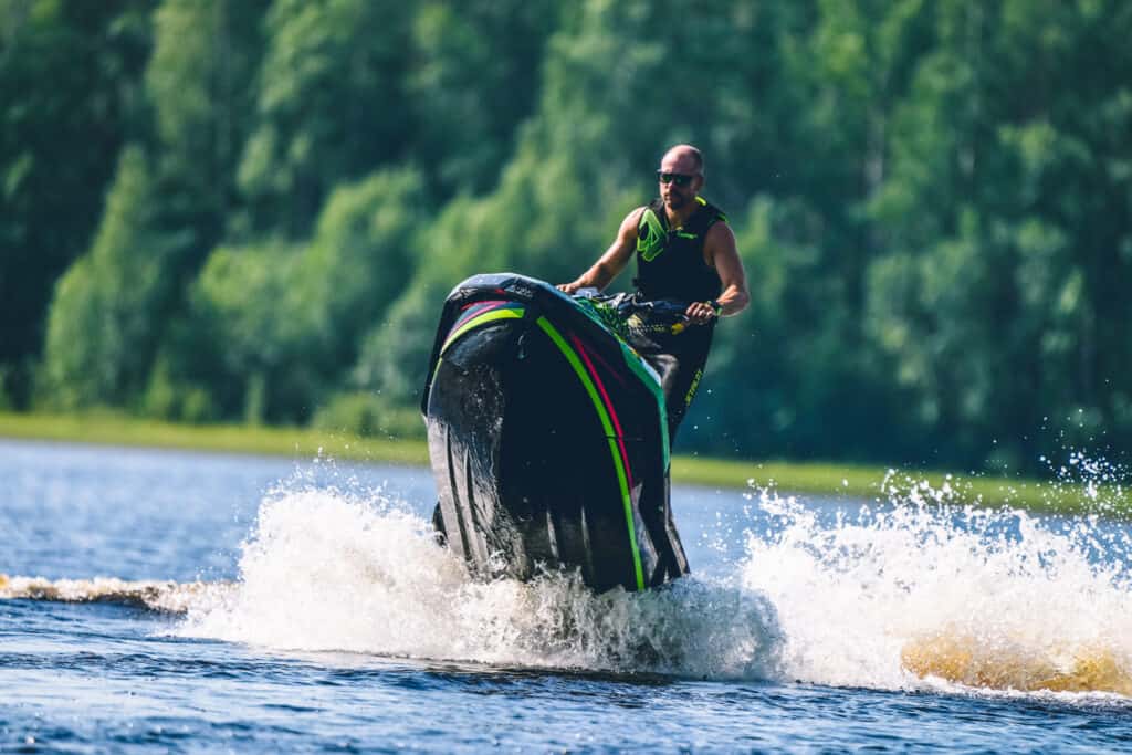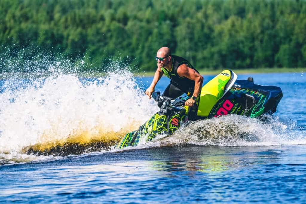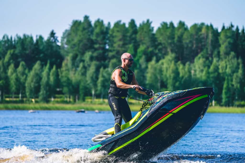De första svängarna gjordes i en insjö och vattnet var betydlig varmare än vad som var väntat, detta genererade i att den första kördagen blev både lång och rolig. Det dröjer en stund innan man blir bekant med maskinen, den ger ett väldigt lekfullt intryck och till en början är det galet roligt att bara träna på att köra med nosen upp i det blå. Tack vare att du kan ställa jetstrålen väldigt mycket på den här modellen kan du på en par sekunder helt ändra karaktär. Det kan nog vara den egenskapen som jag har uppskattat mest om under den här sommaren, vill du ta en tajt kurva med nosen nere så kan man snabbt ställa in det. 900 ace motorn med sina 90hk är skottsäker och kör du med sportmode känns maskinen pigg, den ger helt klart mycket glädje per hästkraft.