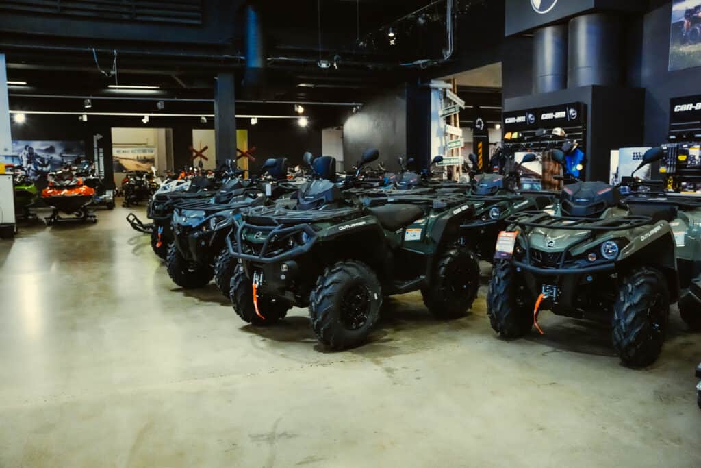 Blir mött av Mikael som visar mig runt i deras anläggning. Måste erkänna att man möts av storslagna lokaler som kryllar av leksaker allt från vattenskotrar från Sea-doo, ATV´s från Can-am, Snöskotrar från Ski-doo till motorcyklar av diverse märken. I leveranshallen skymtar vår maskin till och efter lite pappersarbete får vi se vår pärla för första gången och med det även en grundlig genomgång över maskin och tillbehör från Mikael.