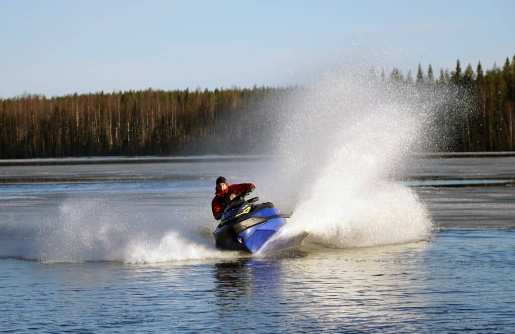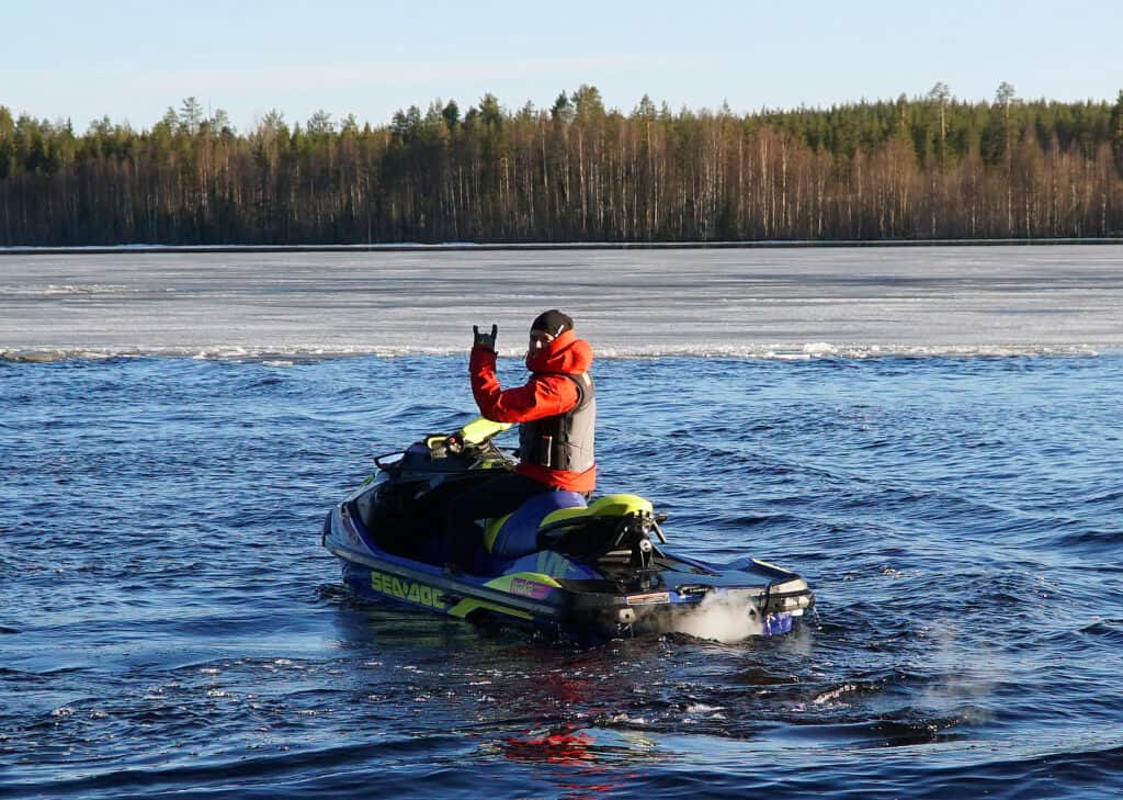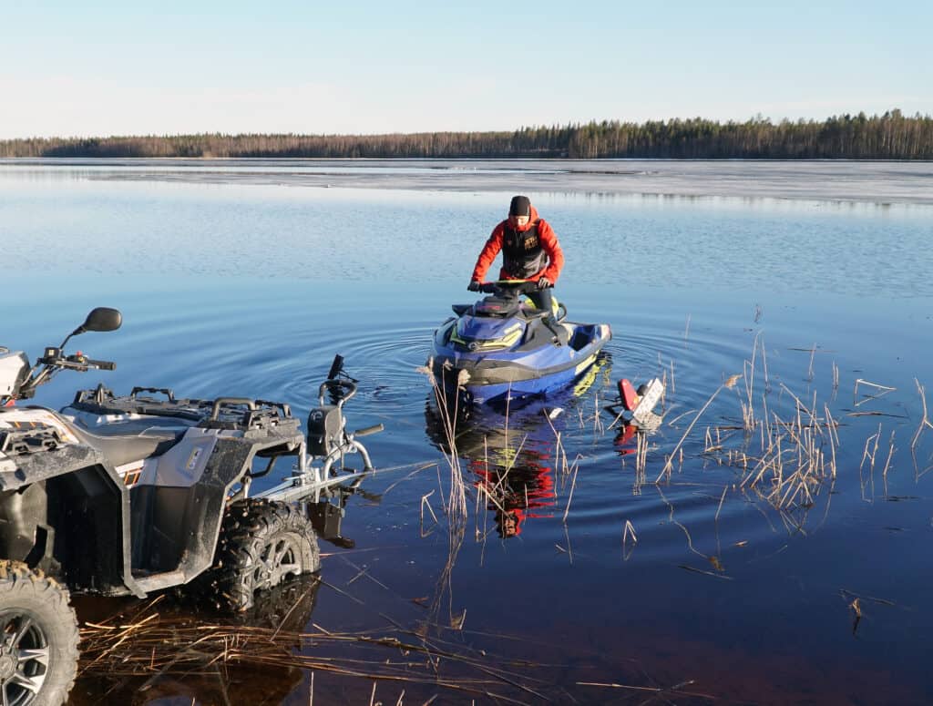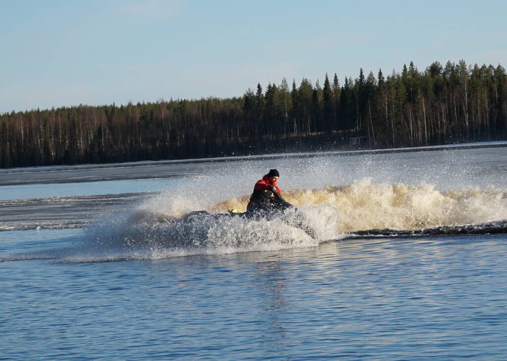 Vad denna stackars vattenskoter inte visste var att den nu skulle få åka 60 mil norrut där isen fortfarande ligger på sjöarna. Men som ”tur” är har vi några öppningar att åka på, för självklart var vi tvungen att testa nyförvärvet! Efter en sjösättning i det cirka tre grader varma vattnet var det dags för en första start av den trecylindriga Rotax motorn på 1630 cc och kompressor.