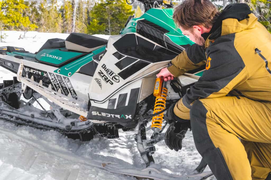 Vad hände med vintern? Det blev den fantastiska vår-vintern snabbt i år och det känns. Inte minns när vi kör på leden och det enbart är några decimeter snö. Bara efter någon kilometer kändes dämparna en aning mjuk då dem är anpassade för pudersnö. Det fick därför bli ett stopp för att justera upp dem några klick. Snabbt och enkelt fixat i solen! Vidare svävade man som på moln med den optimerade fjädringen från Öhlins på den annars ganska guppiga leden.