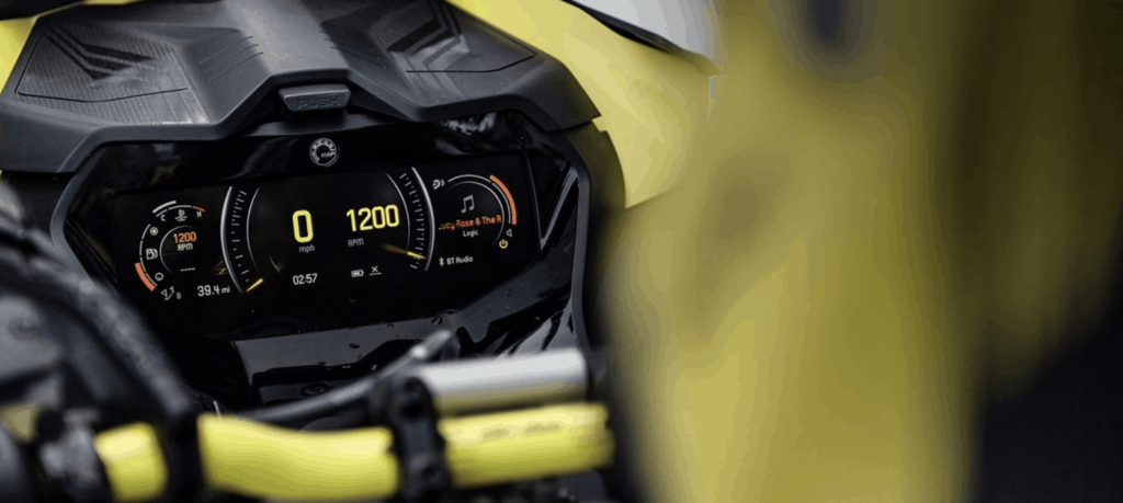 För den som var ute i god tid och beställde sin Ski-doo Renegade X-RS under våren fanns möjligheten att lägga till deras nya mätare, en 7.8” bred LCD display. Förutom att den är snygg och känns modern kan du enkelt koppla din telefon mot den, du har möjlighet att köra navigering med hjälp av BRP´s egna app. Med kompatibelt headset kan du svara på telefonsamtal eller spela musik, det här känns helt klart som rätt kliv in i 20-talet.