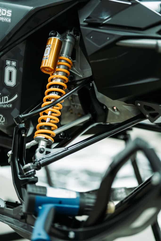 En av de största uppdateringarna vi har gjort är en total uppgradering av fjädringen där vi monterat stötdämpare från Öhlins runt om. Micke Nordström i Skellefteå på Öhlinscenter har hjälpt oss här och skruvade in i det sista för att hinna leverera dessa till oss då efterfrågan i år varit rekordstor. I och med detta byte har vi nu justerbar kompression och retur på samtliga stötdämpare som dessutom ska klara betydligt tuffare körning än original.