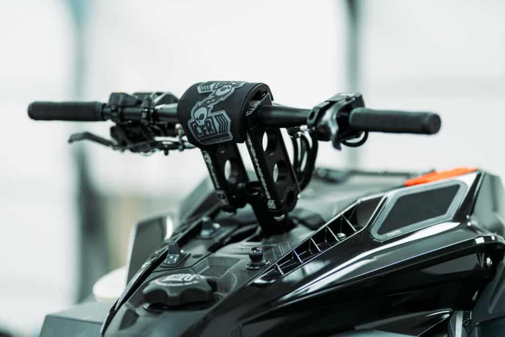 Förarmiljön har vi också jobbat en del med och monterat ett Cheetah factory racing styre som heter Rooster och är nytt för i år. Det speciella med det är att det är rakt utan höjning i själva styret samt att det är lite smalare för dom som brukar kapa och göra styret smalare. Vi valde att montera styrhooks från Polaris som har 90 graders vinkel och ger ett bra grepp i sidled. Styrhöjare kommer också ifrån CFR och är 5” hög och den tillsammans med styret gör att vi är cirka en tum lägre än originalstyret. Och för att få bromshandtaget närmare styret med bättre känsla har Modshop hjälpt oss med ett eluppvärmt bromshandtag från Skinz där pricken över i-et är ett skydd för bromsbehållaren från Ski-doo.