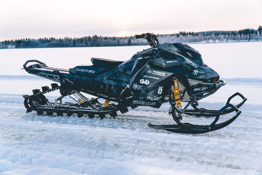 I år valde vi en riktigt diskret look på vår ski-doo summit 850 turbo där vi har ett svart grått camouflage mönster på ett dekalkitt ifrån grabbarna på Swetown, det ger ett unikt utseende som ändå blir stilrent. Och för att rädda originallyset om olyckan skulle vara framme monterade vi ett Skinz headlight delete kitt. Men vi ville inte köra utan lyse och därför har vi även här använt oss av produkter från Backwoods bmp med ett Led lyse de säljer. Stilrent och snyggt trots att det lyser betydligt bättre än halogenlamporna som sitter original.