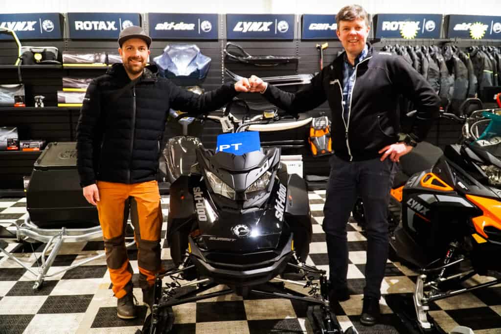 I vanlig ordning flyter alltihop smidigt. Ulf påminner om de generösa garantierna på fyra år som maskinen har. Vi surrar även lite tillbehörsutbud och serviceschema som måste följas för att bibehålla de fyra åren av garantin. Instrumentpanelen som skotern levereras med är inte den nya som visningsmaskinerna i våras hade. Ulf informerar att dessa kommer att bytas ut till den nya modellen så fort man lyckas frambringa klustret. Efter en trevlig pratstund utbyts ägarpapper och börsen blir genast drastiskt lättare. Eller kortet känns i alla fall det. Sen lastas maskinen med ett leende på läpparna. Nu hoppas vi för allt smör i Småland att det börjar toksnöa. För tillfället är det alldeles för lite snö för att kunna göra en ordentlig första sväng här i skogarna runt Arvidsjaur. Så hjälp oss be till Kung Bore så kommer nästa uppdatering att dyka upp bakom knuten. Var beredd!