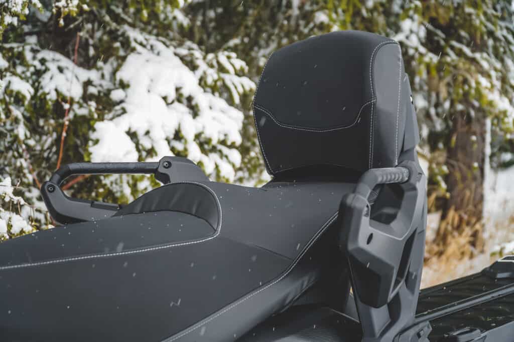 Eftersom att vi är hela fem personer som drar iväg på skotern under vårkanten blir orginaldynan aningen liten att rymmas på. De mindre passagerarna föredrar skoter framför pulkan många gånger, och därför har vi valt att montera en dubbeldyna med tillhörande ryggstöd levererat av Oktan Sverige AB. För att kunna montera dubbeldyna måste man sätta ett linq-fäste vid batteriluckan där bak. Man monterar även två stycken piggar ovanför tanken. Dessa var aningen bökiga att få dit, egentligen ska man lossa på panelen men det gick att lirka dit dem utan att behöva göra det. När de väl är på plats är det enkelt att byta mellan dubbeldynan och orginaldynan. En riktigt smart lösning när man ska ut själv och klättra och inte vill släpa på den stora dynan och ryggstöd. Det tar ungefär två minuter så har man bytt från dubbeldyna till enkel, och även plockat av ryggstödet.
