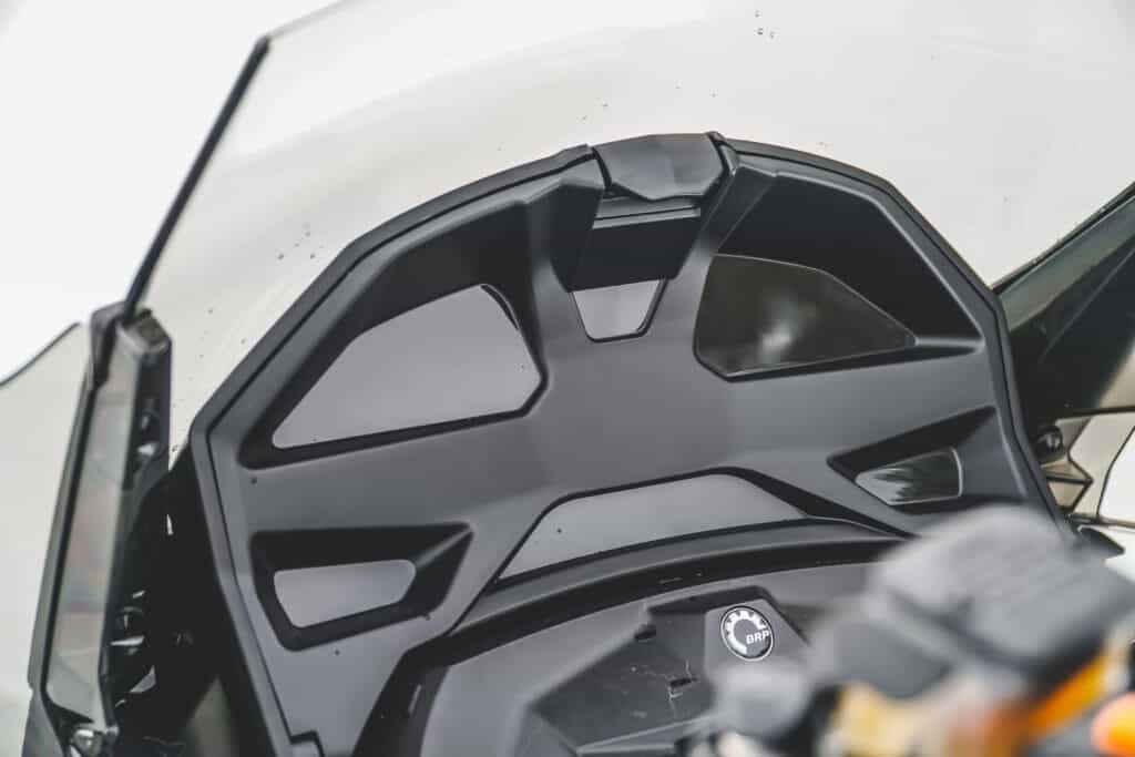 Vi har även monterat ett förhöjt handskfack. Det gör att det sammanlagda utrymmet expanderar till åtta liter från tidigare fyra. Nu rymmer man med lätthet några par handskar, glasögon med mera. Handskfacket är uppvärmt, superskönt när man fryser om händerna att bara kunna plocka upp ett par varma vantar. Framsidan på facket är utformat för att kunna montera en Gps, och det finns fästen att köpa till för att montera upp den. Sen kan man också montera ett 12-voltsuttag inuti facket för att få konstant strömförsörjning.