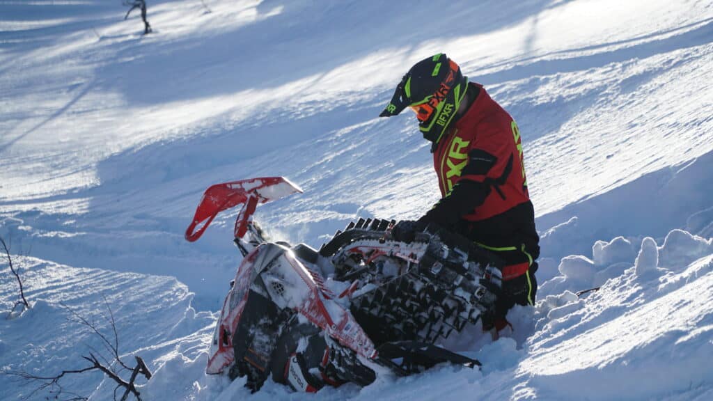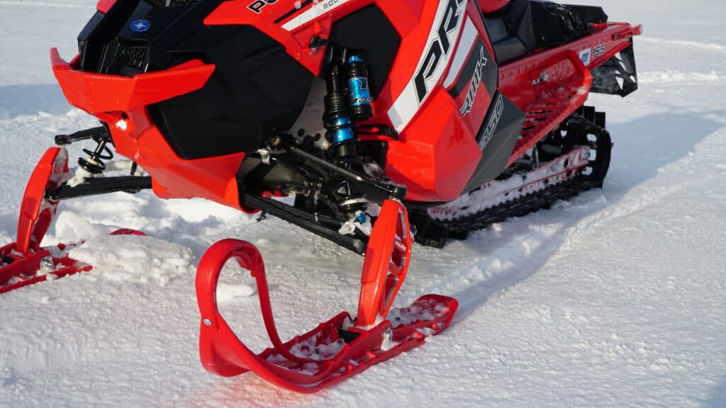 Raptor Kinetic V1-RC heter stötdämparna som vi passade på att testa och här kan vi snacka om fina produkter. Smäcker design med läckra detaljer av eloxerad fräst aluminium, dem skriker 100% billet. Men det är inte bara show dessa stötdämpare, justerbar kompression och retur i 20 steg samt en ny funktion med ”internal bypass” skall göra att körningen blir en fröjd. På centerdämparen finns det justerbar kompression i 20 steg och på bakre stötdämparen i boggien finner man både kompression och returjusteringar. Här hitta man även snabbjustering av fjäderspänningen via en kamjustering i 3 olika lägen. Man kan säga att det finns gott om inställningar att laborera med och vi passade på att vrida på alla skruvar under vår provkörning. Snöförhållandena var undermåliga, vilket kanske var extra bra för detta test eftersom vi fick köra på allt från isiga guppiga leder till mjuk och härlig puder.