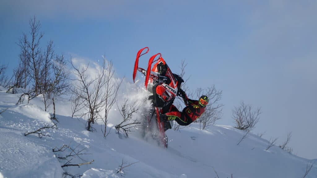 Utan att ha rört en enda justerings-ratt drog vi iväg ut på fjället, vi märker ganska direkt på den hårda och guppiga leden att stötdämparna är av mjuk setup. Här på leden får vi ta nytta av den goda justering som finns på dessa dämpare, både kompression samt retur ställs upp ett antal klick och nu är skotern helt fantastisk att smiska led med. Väl uppe på fjället kommer ytor med mjuk och härlig puder och nu är det upp till bevis. Kompressionen sänks några klick och returen får ligga kvar, de perfekt mjuka dämparna sväljer vartenda gupp vi kastar oss på. Vi lyckas inte en enda gång att få stötdämparna att bottna ute i snön, trots tappra försök.
