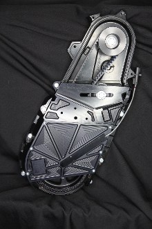 Här kommer vi att spara en hel del vikt när vi byter ut drev och kedja till frästa remhjul i aluminium, samt att remmen i sig som väger betydligt mindre än en metallkedja. En extra fördel är att den roterande vikten blir mindre och ska göra maskinen lite rappare, i vinter kommer vi att återkomma med resultatet.