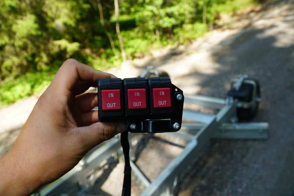 För att få spänning i elsystemet följer det med kablar för att kunna kopplas till ett batteri på ATV/UTV-fordonet, här har vi dock gjort en liten annan lösning. Vi har valt att montera en vanlig 7-polig släpvagnskontakt då de flesta fordon idag har dessa uttag. Nu kan man snabbt koppla sladden till olika fordon och enkelt använda släpvagnskontakten för att få spänning. De tre elmotorerna kan nu styras individuellt från förarplatsen med den medföljande kontrollen, och nu har man riktigt bra inställningsmöjligheter.