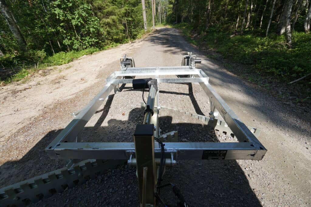 Vägsladden från Bonnet känns rejäl när vi packar upp den för att börja monteringen, både rivstålen samt hyvelstålet är gjorda i kraftigt gods vilket även känns på vikten. Vi följer monteringsanvisningarna som är enkla att förstå och det tar kanske 30 minuter att montera sladden. Det som gör denna unik är att det följer med eldrivna motorer för att kunna justera höjden på bakhjulen samt på dragstången.