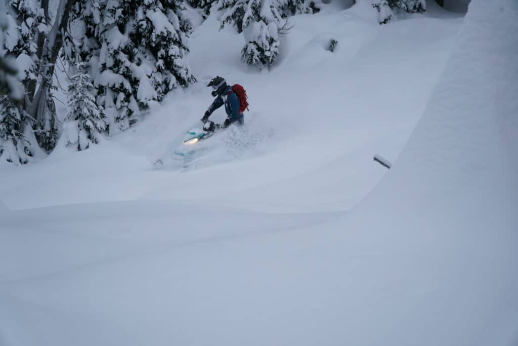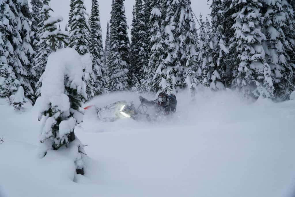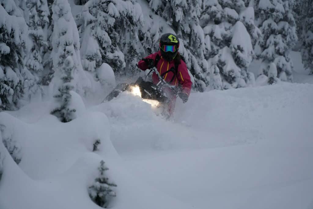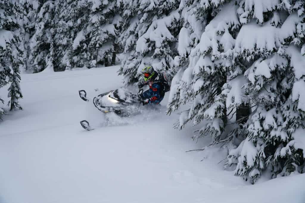När lavingrejerna är nerpackade igen, attackerar vi ett område med tät skogskörning. En gammal favorit sen långt tillbaka. Här sköljer snön över huven i varje burkning och vid utförsåkning kan man höra skriken i hjälmen eka ut i skogen av glädje och upphetsning. Aldrig har man testat på så brutal terräng med stockar, sten och lite därtill, gömt djupt under vitt fluffigt guld.