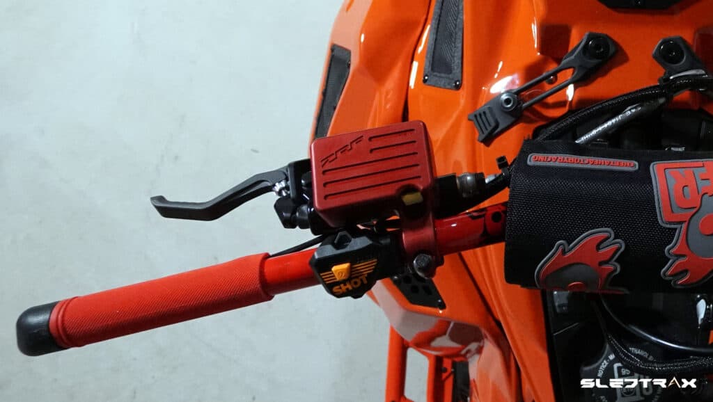 Även bredden på styret har vi justerat en aning då vi kapat av ändarna och skaffat ett par begagnade hooks från en skrotad Polaris. Anledningen är att det ibland kan vara lite för brett styre när man hänger ut mycket på ena sidan av skotern samtidigt som man vill nå styret, det kan tyckas som en marginell skillnad men i många situationer blir skotern betydligt lättare att hantera.