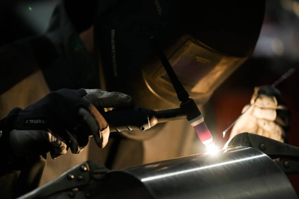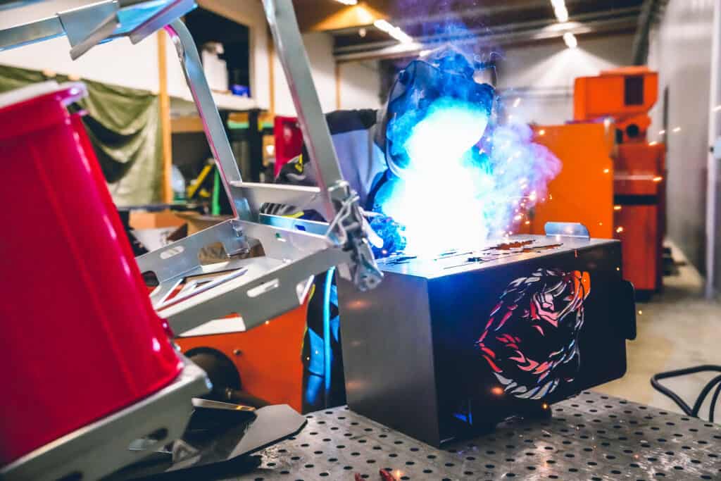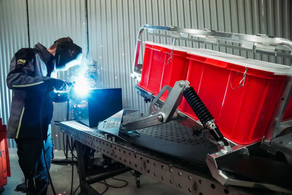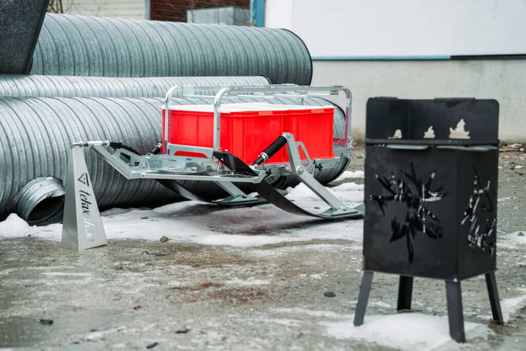 När vi på Sledtrax träffar han i verkstaden är det full huggning (eller snarare svetsning) många av vinterns produkter ska hinna ut till återförsäljarna innan säsongen dra igång på riktigt. Förutom Tekverk kälken tillverkar Jonah även eldkorgar och grillstäder med olika motiv och storlekar.