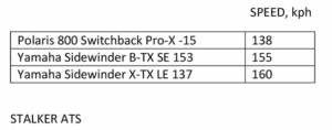 Först ut, som vanligt, referensmaskinen Polaris 800 Switchback PRO-X. Efter tre vändor stannade den snabbaste körningen på 138 km/h. Inte illa, för nu var verkligen banan mjuk och ytan riktigt lös. Sedan var det Yammornas tur och B-TX:en lyckades kasta upp sina 153″ i mäktiga 155 km/h. Ganska OK för en långbandare, eller hur?