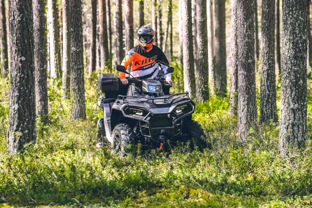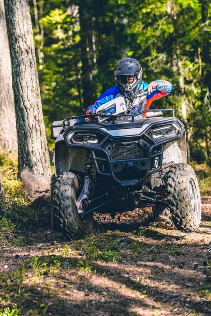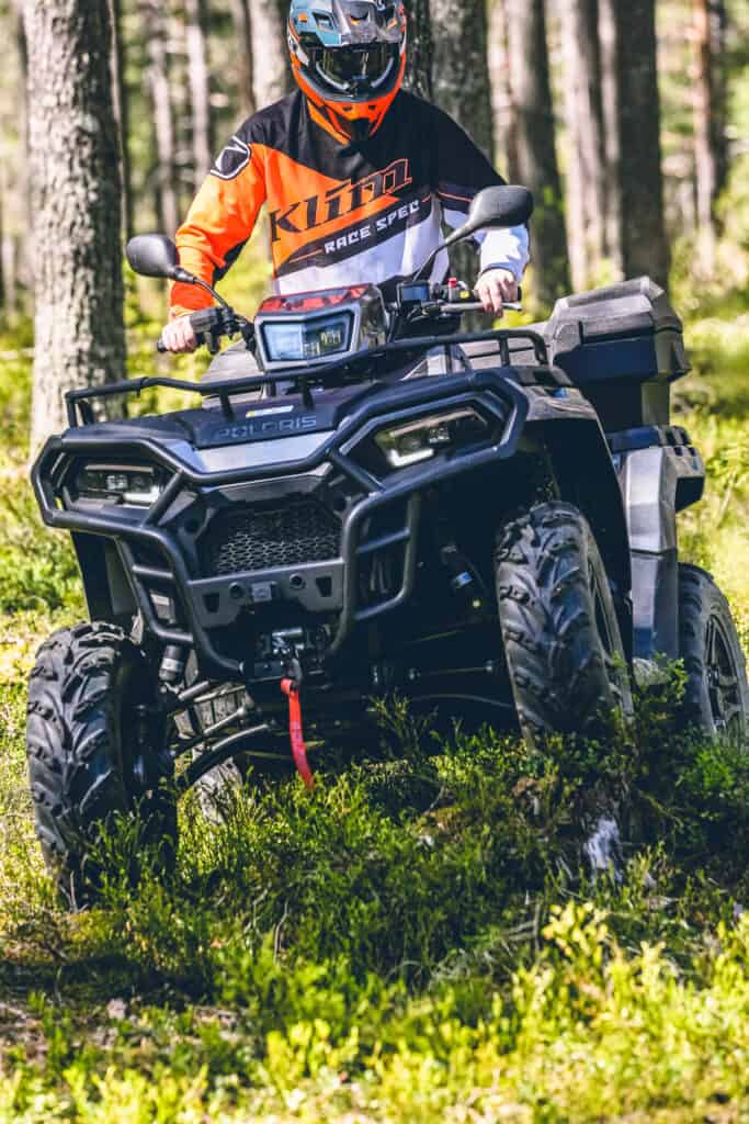 Vid en första anblick ser maskinerna oerhört lika ut. Sportsman modellerna utstrålar attityd, kraft och ett formspråk som onekligen tilltalar undertecknad. Något Polaris tagit till sig de senaste åren av all feedback man erhållit är finishen som nu höjts rejält och genomsyrar dessa ATV´s. Gör därefter en mer noggrann inspektion och börjar se visuella skillnader, b.la. däck och fälg skiljer sig på dessa fyrhjulingar. Tittar vi under maskin hittar vi ställbar fjädring på SP modellen som också likt några av sina storebröder erhållit dubbla böjda a-armar för bättre framkomlighet i terräng. I övrigt är båda utrustade med LED lampor digital display servostyrning och smart förvaring i form av fack framför styret och bakom sätet. Sätter mig på maskin och torrbryter och kan konstatera att förarergonomin känns riktigt bra. Fina ord i teorin men nu vrider vi på nyckel och puttrar iväg, nu ska vi ta reda på hur Sportsman fungerar i praktiken.