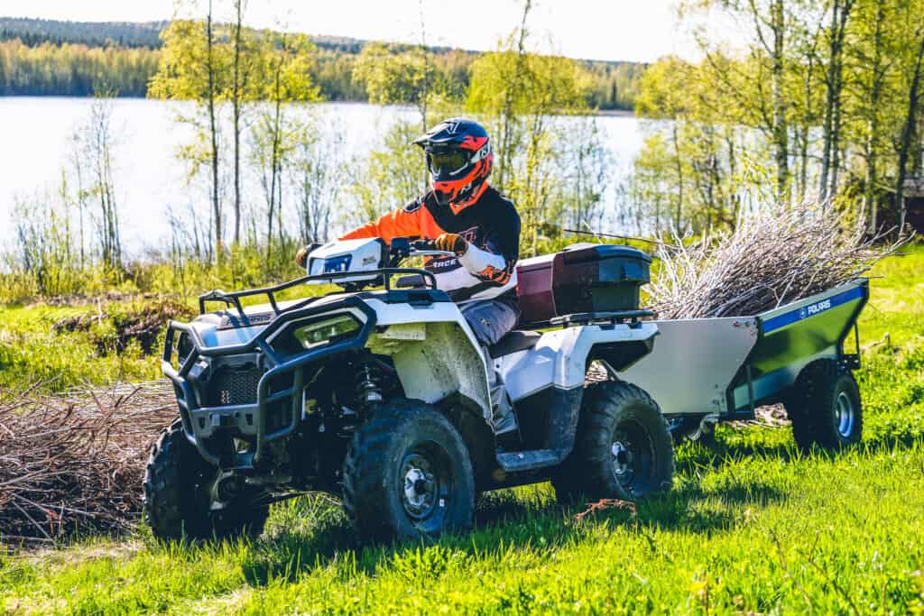 Sätter mig på den enklare modellen POLARIS SPORTSMAN 570 EPS och puttrar iväg nerför gården för att rensa undan lite buskage från hallonbuskarna, något jag numera tagit över från ”frugan” Helt enkelt en bra anledning att få spendera tid bakom styret med min bästa sommarkompis. Inget tyngre jobb men ändå tillräckligt för att testa maskin för lättare arbetssysslor. Den fina gårdsvagnen från polaris gör sig toppen för denna typ av sysslor. Med lågväxeln inkopplad går det att lasta tungt och smyga fram och den smarta enhjulsdriften från Polaris 2wd läge gör att gräsmattan inte behöver ta skada när jag gång på gång kör lass upp på brandgropen. En liten detalj som ändå gör stor skilland. Får även hjälp av EBS motorbroms då gropen ligger i brant nedförluftning.