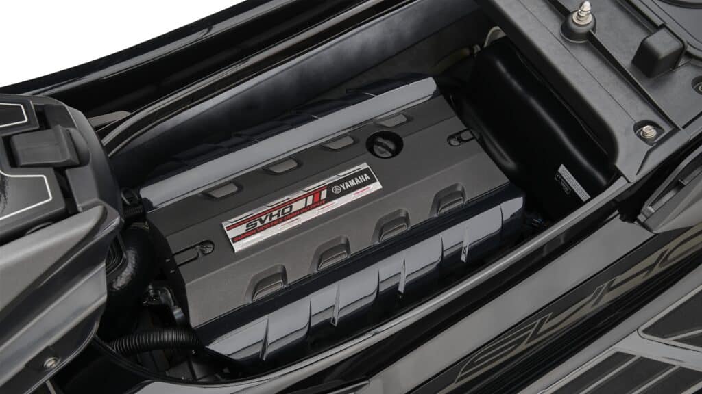 Kraftkällan som driver denna mattsvarta FX SVHO är en överladdad kompressormatad 1812cc ”Super Vortex High Output” motor. Samma snurra fast utan kompressor som vi testade under VXR skalet föregående år. Denna motor har 4-cylindrar 4-takt och med kompressorn ger den hela 260 hästkrafter mätt på strålen vilket borgar för en fartfylld upplevelse.