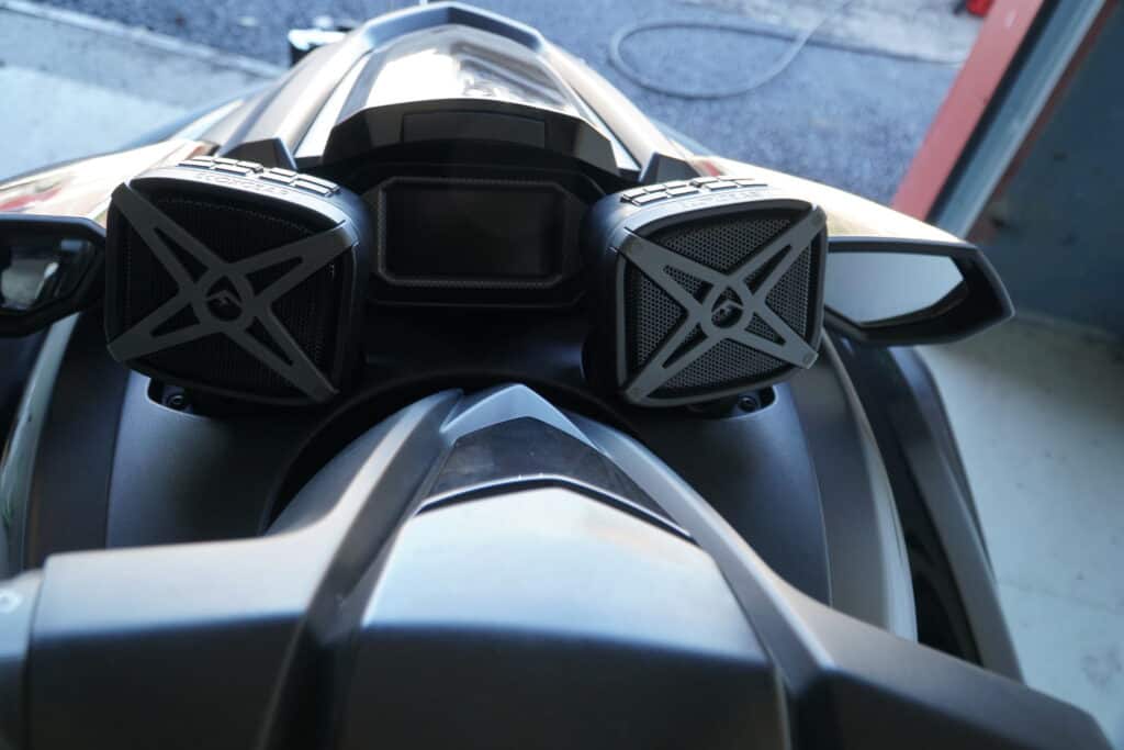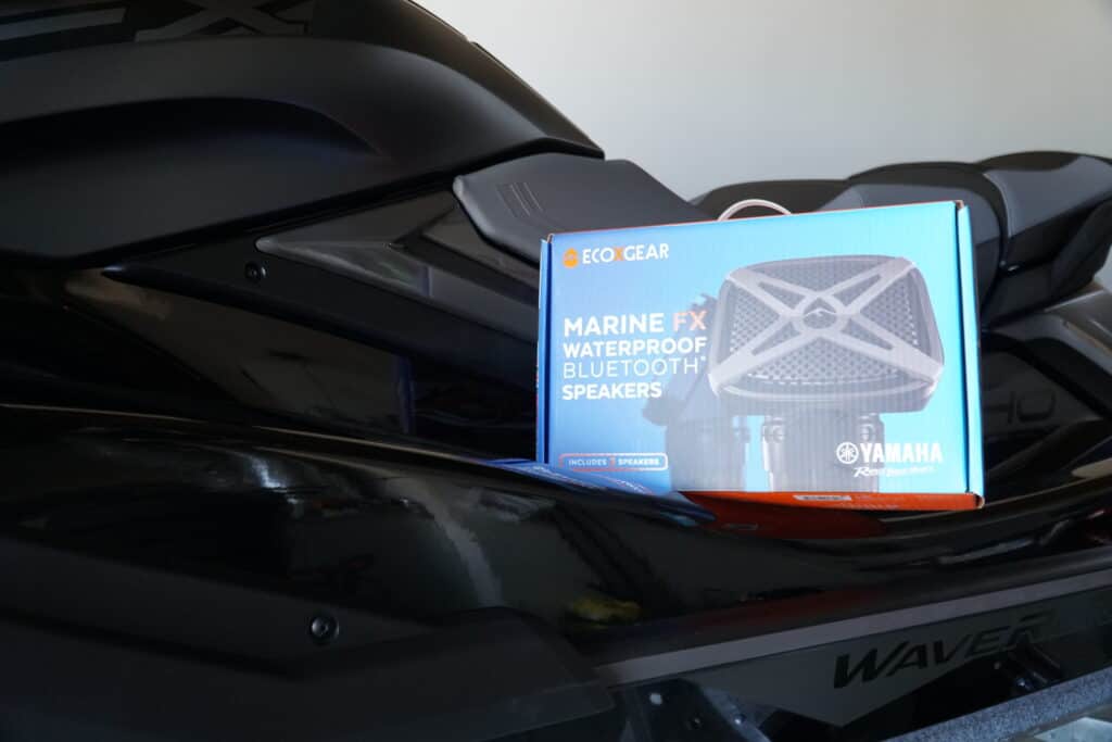 Väl i garaget monteras och provspelas ett ”måste” tillbehör för batmobilen. EcoXgear nya högtalare för Yamaha FX serien. Med 30 watt ska dessa dunkadunka talare höras klart och tydligt även under snabba hastigheter på vattnet något vi får pröva längre fram.