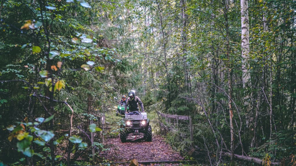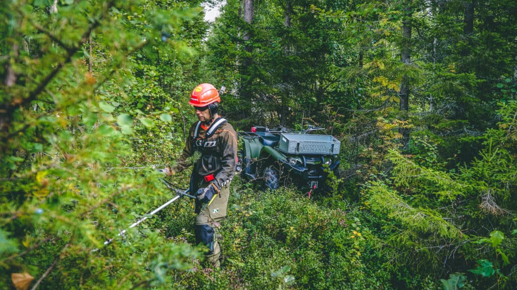 Jakten innehåller så mycket mer än själva fällandet av bytet. Det krävs mycket förberedelse och tid på markerna, dels för att reka av vad som har hänt sen förra jaktsäsongen men framförallt att se att saker och ting är i ordning. Skjutgator ska röjas och älgtorn inventeras innan det är dags. Här kommer Kodiaken väl till pass, med röjsågen fastspänd gav vi oss ut för att inventera hur skjutgatorna såg ut. På vår väg ut var vi tvungen att passera terräng som var ganska stökig med mycket stubb och sten. Än en gång kom det eftermonterade bukskyddet väl till pass för att skydda underredet, vi fick även sätta björnens framkomlighet på prov.