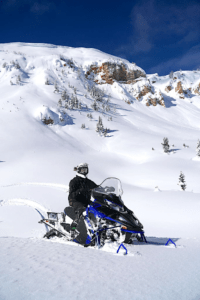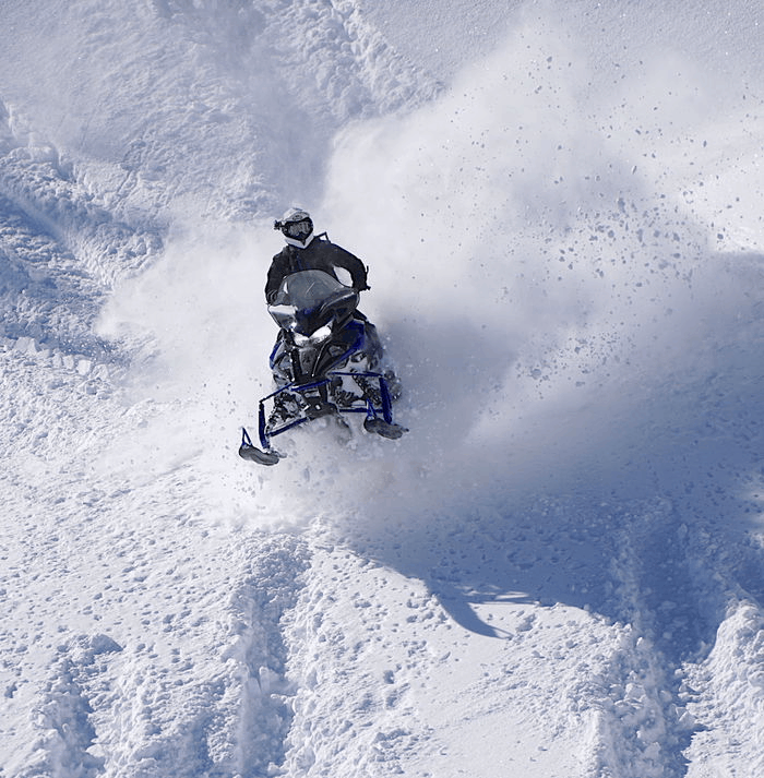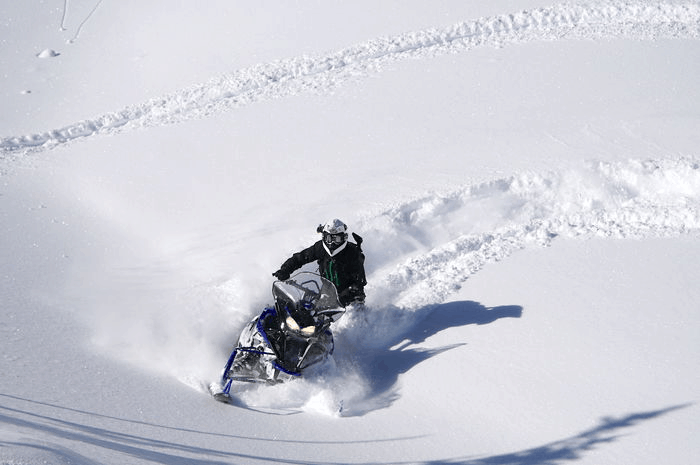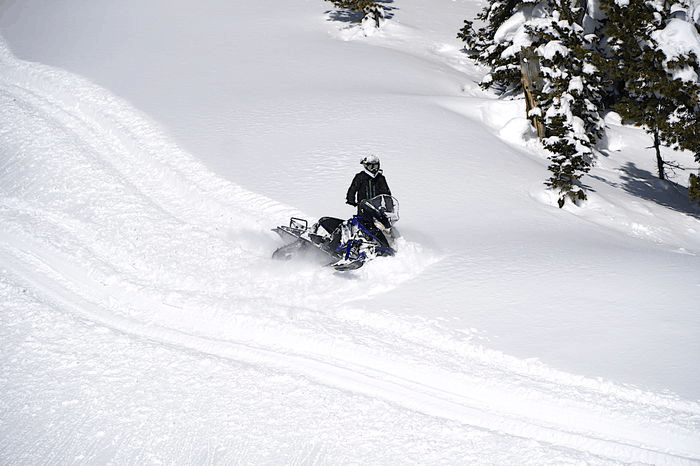 Vidare går färden och uppe på de höga bergen i West Yellowstone där breder vidderna ut sig och lössnön ligger djup. Här sätts maskinens lössnöegenskaper verkligen på prov. Varvtalen ökar på motorn och utan problem svänger denna maskin fram i snön som bara spolar upp över huven. Skråkörning längs sidorna av de stora branterna känns ganska naturligt. Till sist faller ögonen ner på skotern och man undrar om denna skoter verkligen skall klara allt detta, men det gör den.