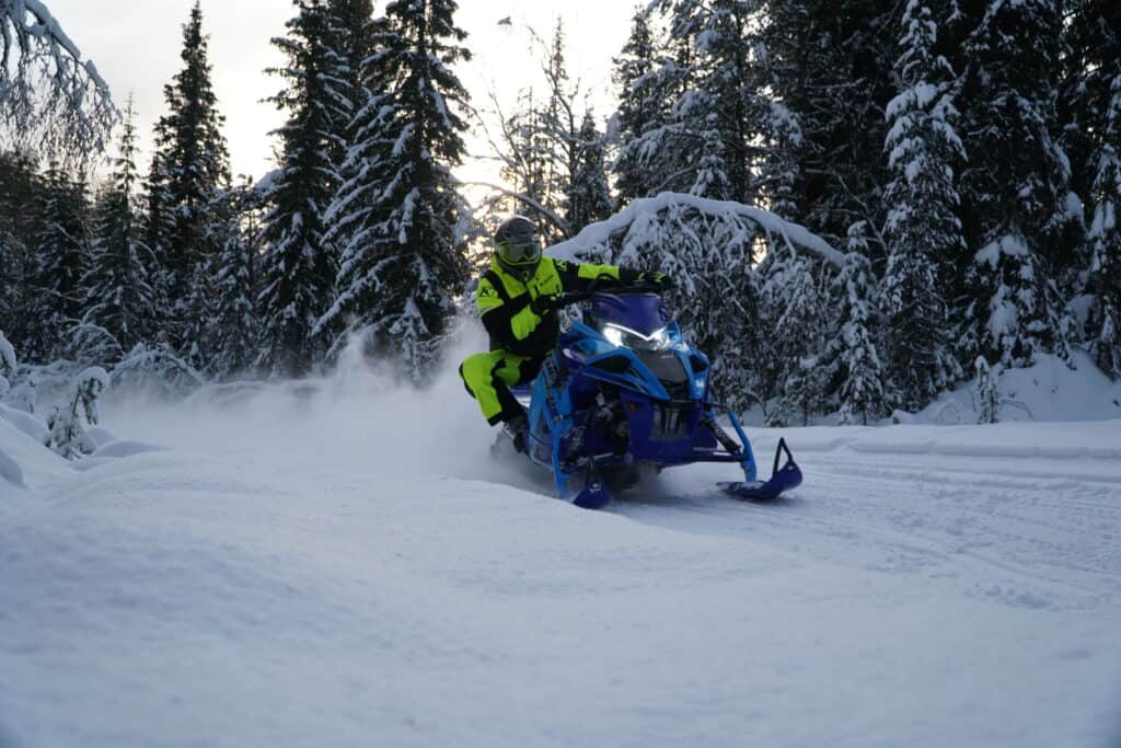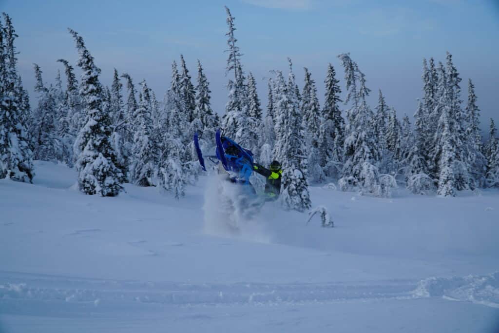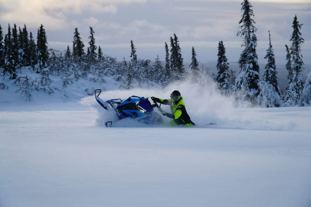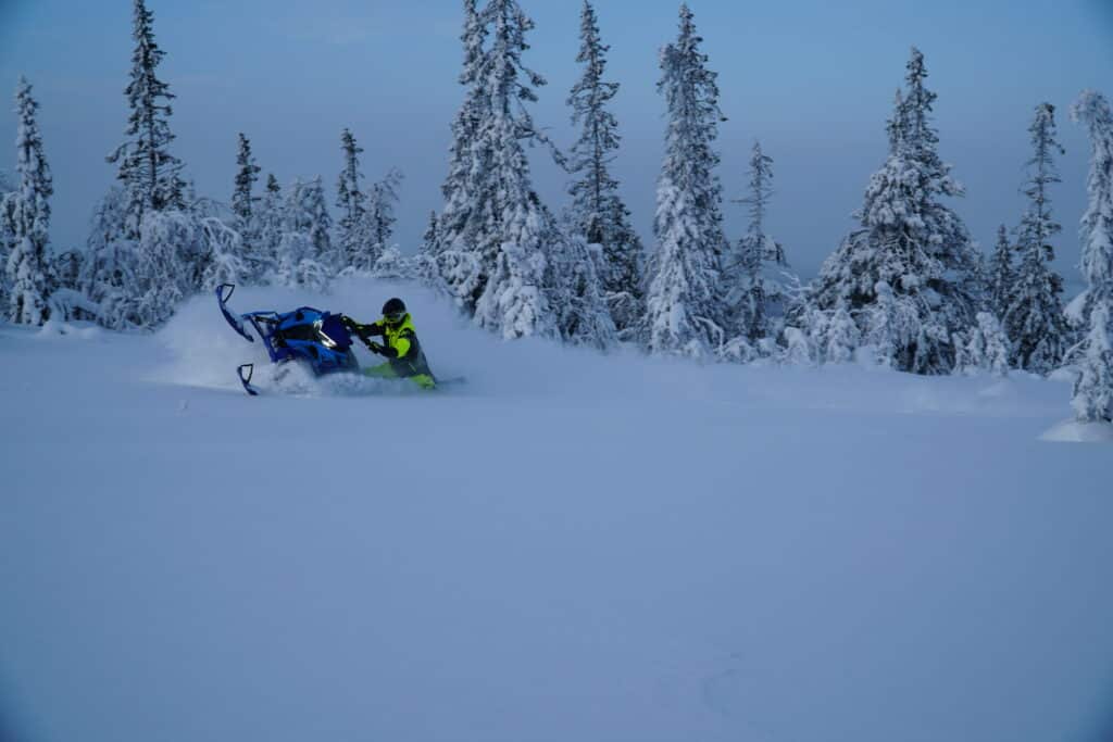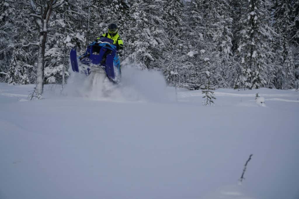 Klämmer tummen mot styret och in i myrsystemet går både maskin och förare på fulla rus. Åkandes på rullen entrar vi det första området för bus och lek för dagen. Snödjupet är över förväntan med ca 60cm snö tillsammans med en botten på hälften bjuder området och Yamaha Sidewinder M-TX 153 upp till full dans. Flertalet fullgasrepor på rullen växlas med djupa pudersvängar. Detta är enormt beroendeframkallande och jag kommer snabbt till insikt om varför jag just älskar snöskoteråkning.
