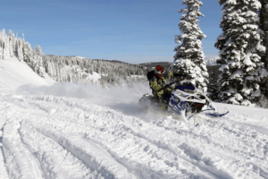 Efter att vi har provat på vad de välpistade lederna har att bjuda på så viker vi av och ger oss ut i djupare snö. Visst känns det att den är en aning kortare matta och lägre kammar när det kommer till lösare snö, och passar man sig inte och håller flyt på maskinen så står man där med skägget i brevlådan. Andra bullar blir det om man aldrig låter den stanna av, då kan man med motorns kraft paddla sig fram riktigt bra. Mattans snurr gör det möjligt att klättra på även i lösare snö uppåt. Där snön var mer kompakt men fortfarande ändå lös, där gasade vi upp i fina backar med friskt leende på läpparna. X-TX SE har mycket att tacka den vilda motorn för sin busiga attityd.