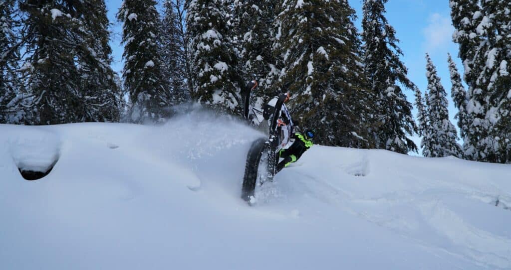 Väl på plats ute i skogen letar vi upp brantare terräng för att se hur sidewindern beter sig, vi kan konstatera ganska snabbt att det är en grymt busig maskin som går att göra tighta vändningar med. Vi märker även att skillnaden mellan YAMAHA SIDEWINDER XTX och fjolårets MTX är ganska tydliga, du måste ligga med en högre grundfart och planera körningen på ett annat sätt. Däremot tar XTX`n sig riktigt bra med tanke på att det ”bara” är 51mm kammar på mattan, givetvis blir man hjälpt av den höga matthastigheten som blir vid hårdare gaspådrag.