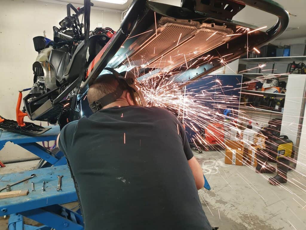 Vi på Sledtrax märke ganska tidigt att vid lek och klättring tog både tunnel och bakbåge emot när skidorna står rätt upp i vädret. Receptet för att lösa det blev en kortning av bandtunneln och montera på en lyftbåge från en 141” XTX . Det är kanske inte något som görs i en handvändning då kylarledningen är popnitad i hela bandtunneln och kylelementet sitter längst bak, det krävdes lite jobb men vi är helt klart nöjd med hur resultatet ock looken maskin nu fick. För den som har ett vältränat öga så syns det att lyftbågen fått en lite brantare vinkel också.