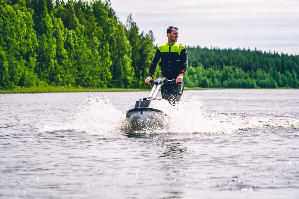 Efter att ta tagit några varv runt en mindre konbana är det nu dags att se om vingarna bär. Med ett snabbt kliv är vi uppe på fötter och det känns helt naturligt, som att vi inte gjort annat det senaste halvåret. Nu växer dock hornen ut och den där konbanan skall vi nu se om vi kan få några varvtider på. För om än vi har mycket att lära så är det barnsligt roligt att få luta sig in i kurvorna med denna typ av maskin. Givetvis är det riktigt kul att känna slitet i armarna på en 300hk vattenskoter, men detta är någon helt annat. Det är en fantastisk känsla som man måste prova för att uppleva. Maskinen sitter som klistrad i vattnet och den vridstarka 4-taktsmotorn levererar kraft i överflöd när man pressar sig fram genom kurvorna.