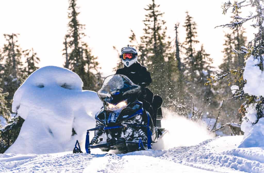 Färden går slingrandes på skoterleden genom dalgångar med storslagen granaskog vidare mot fjället karga sida i sällskap av fjällbjörkar. På leden glänser Yamaha Transporter som vilken ledracer som helst, fästet i 57mm mattan är skarpt och 600 motorn flåsar och ger hårresande acceleration från kurva till kurva.