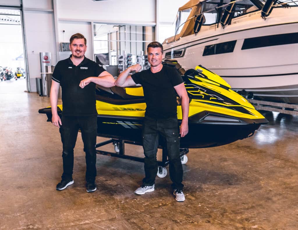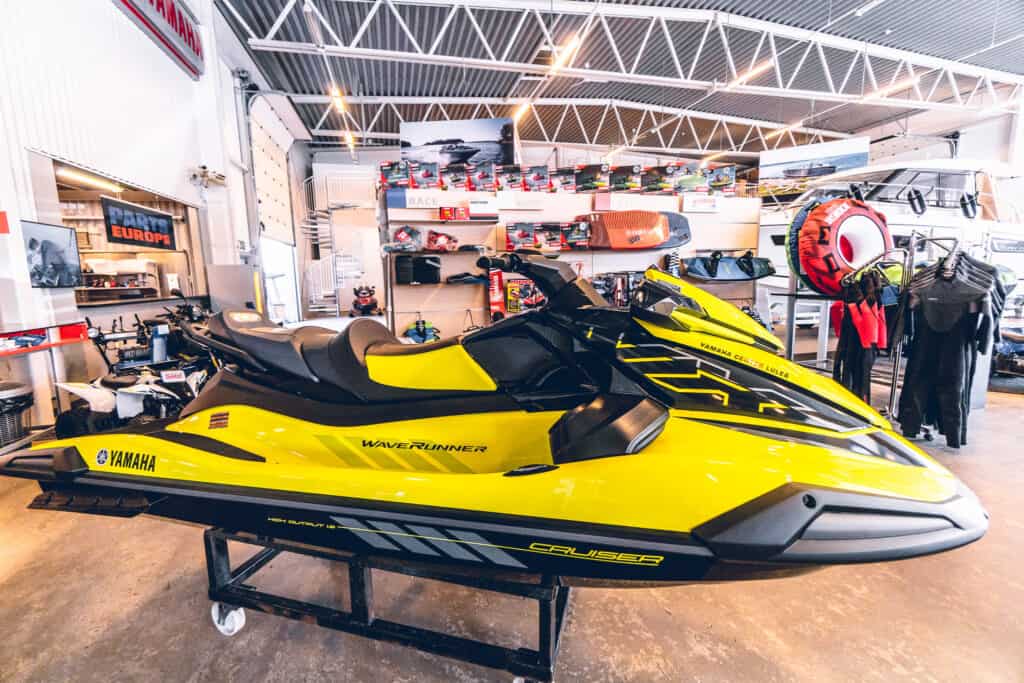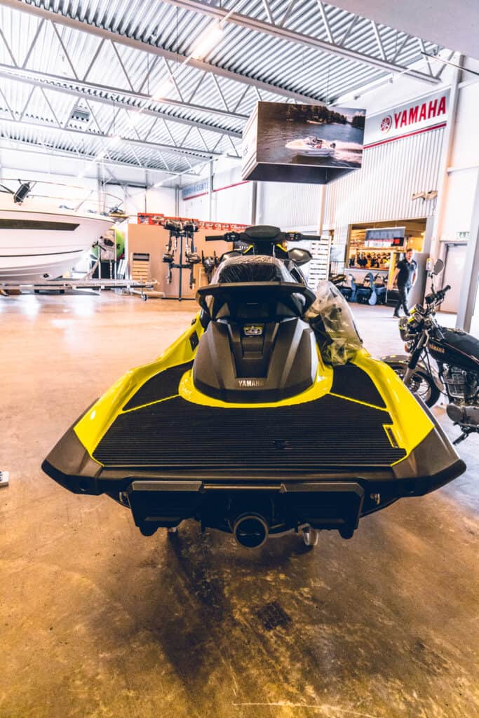 På Hed´s Yamahacenter i Luleå är det minst sagt välfyllt med offroadfordon för alla säsonger och underlag, det finns även ett stort sortiment av personlig utrustning, vattenleksaker och reservdelar som gör att man kan få ut mer nytta och nöje oavsett fordon. Men just denna dag är det fokus på en vattenskoter som är ny för året och väl inne i butiken fick vi syn på en knallgul maskin med diskret fast sportig grafik längs sidorna. Är det verkligen en Cruiser som ser så otroligt raceinspirerad och läcker ut, japp vi har sett rätt maskin och vi får en bra känsla direkt!
