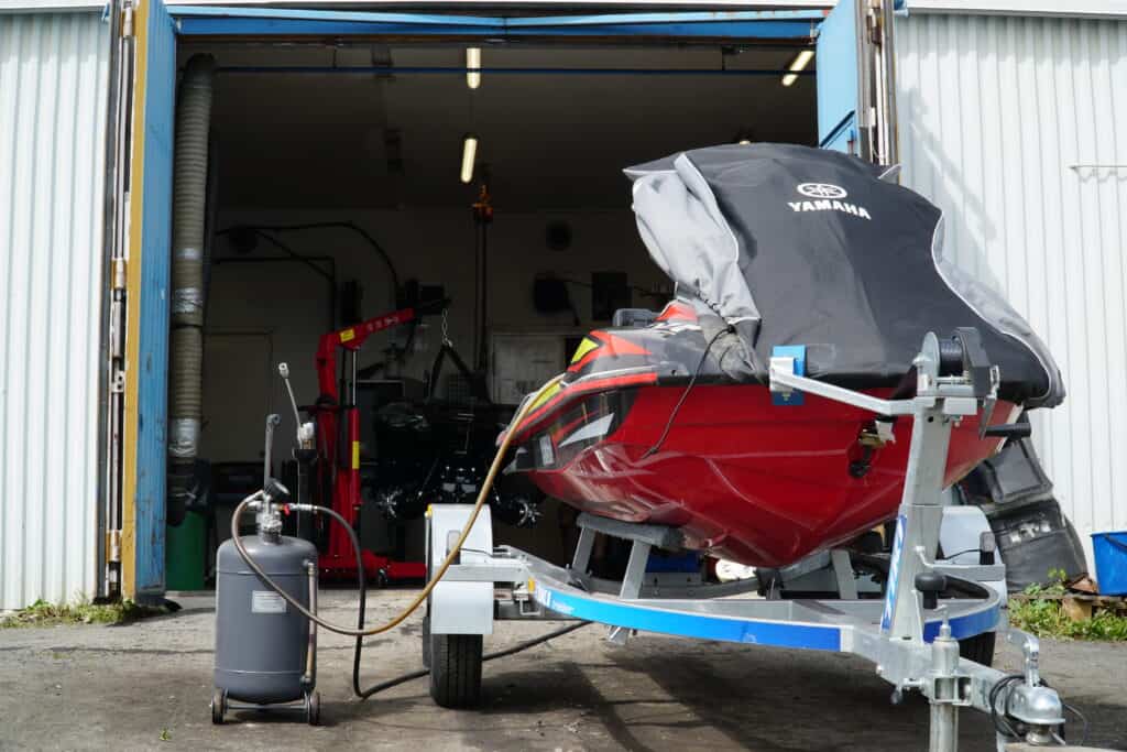 Vi börjar med att hämta vår sommarvän som precis har varit på 10 timmars service och fått rikligt med kärlek och omtanke av Niklas Höglund på Yamahacenter i Östersund. Olja har byts i den 4 cylindriga 1800 cc motorn och maskin har kontrollerats, allt för att undertecknad fortsättningsvis ska kunna njuta på sjön utan några större problem. Lastningen sker snabbt och helgens utflykt går till en väns stuga i södra Härjedalen.