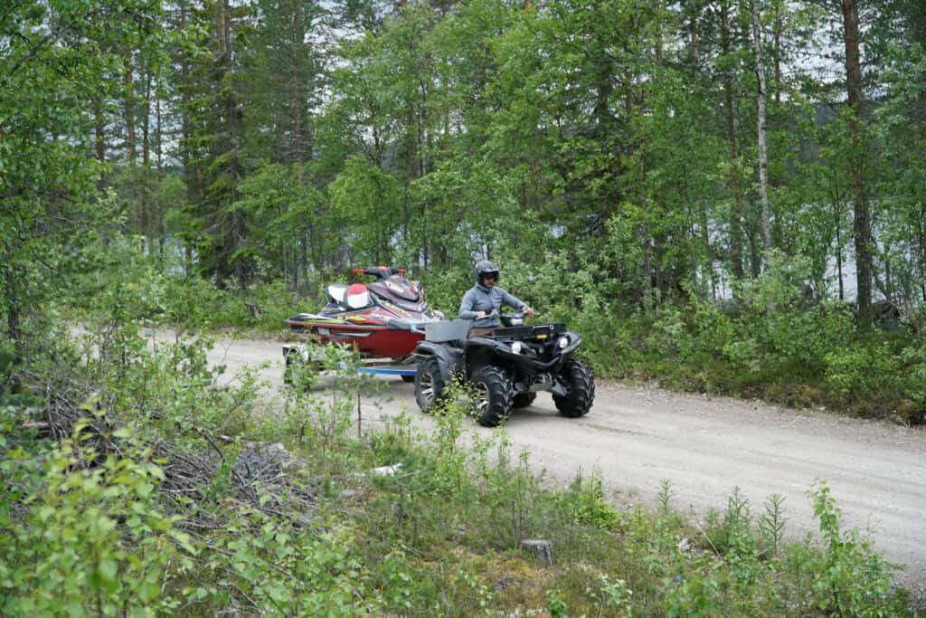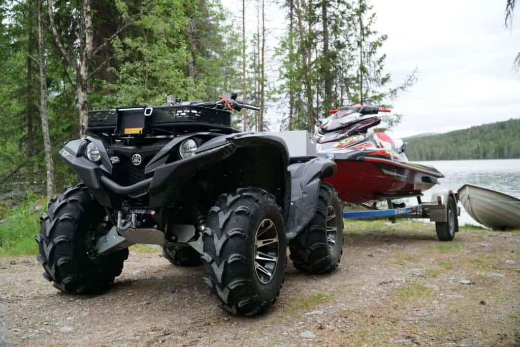 Med på resan är även vår Grizzly 700. Allt för att underlätta sjösättningen av maskinen vid denna vackra och ödsliga stuga långt in i Härjedalens fjällvärd. Med en påkopplad tiki vagn går sjösättningen smidigt vid en av sjöns stränder. Sjön som inte är större än någon kvadratkilometer ska snart bli en av sommarens roligaste lekplatser.