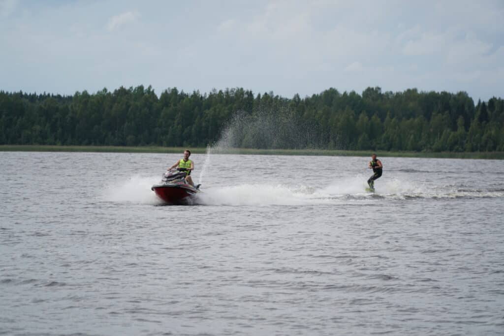 Emil Vanhatalo som också är på plats sjösätter sin vattenracer från Arctic Cat och Navis. Full fart med maskinen han ska tävla med under sommaren. Gör ett par burkande svängar och susar förbi om och om igen medan vi andra njuter av en bit mat.